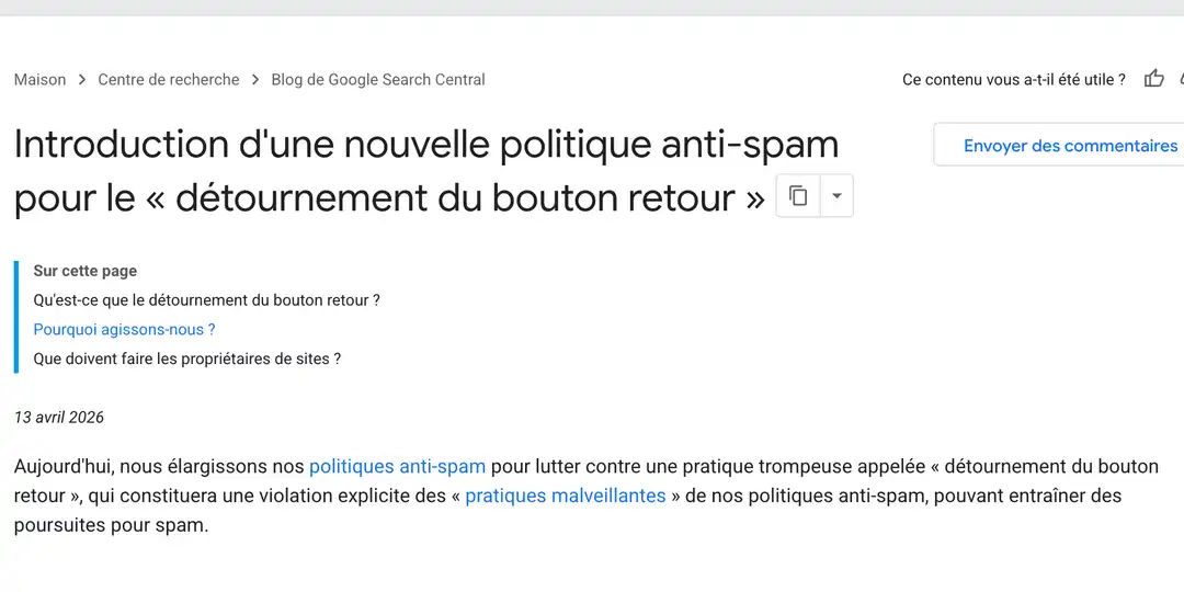 D’abord toléré par le géant du web, le détournement du bouton “retour” a finalement fait son apparition dans les politiques anti-spam de Google ce lundi 13 avril 2026. Le back button hijacking est désormais considéré comme une pratique malveillante et donc sanctionnable. Mais alors, pourquoi Google ne s’en préoccupe qu'aujourd'hui ? Tout simplement parce qu'il a constaté “une augmentation de ce type de comportement” contraire à l’expérience utilisateur.