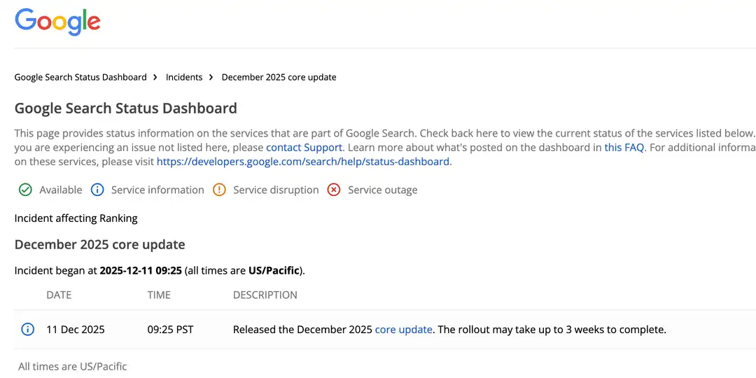 Comme annoncé sur le dashboard officiel de Google, le déploiement de cette mise à jour majeure devrait durer près de trois semaines, comme les autres fois, avec une fin prévue aux alentours du 1ᵉʳ janvier 2026. Pour rappel, il s’agit de la troisième Google Core Update de 2025, puisque la première avait été enclenchée le 13 mars et la seconde le 30 juin.